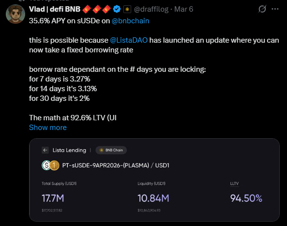 Cross-chain PT-sUSDe means we can now tap into ListaDAO on BNB Chain for up to 35.6% APY.